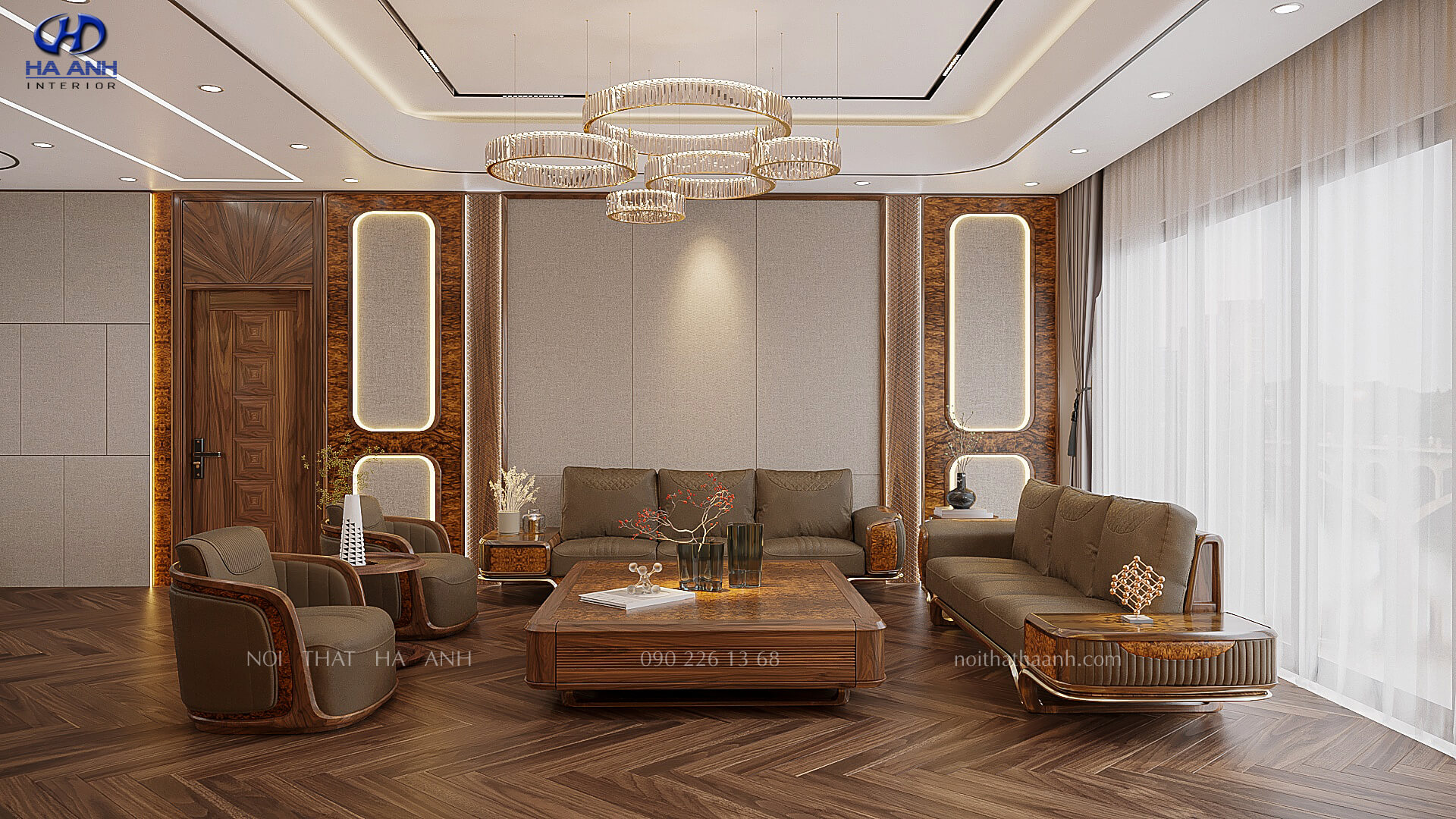 - Bộ Sofa gỗ óc chó tự nhiên, bề mặt hoàn thiện sơn PU inchem màu nâu đen kiểu dáng mang phong cách Ý