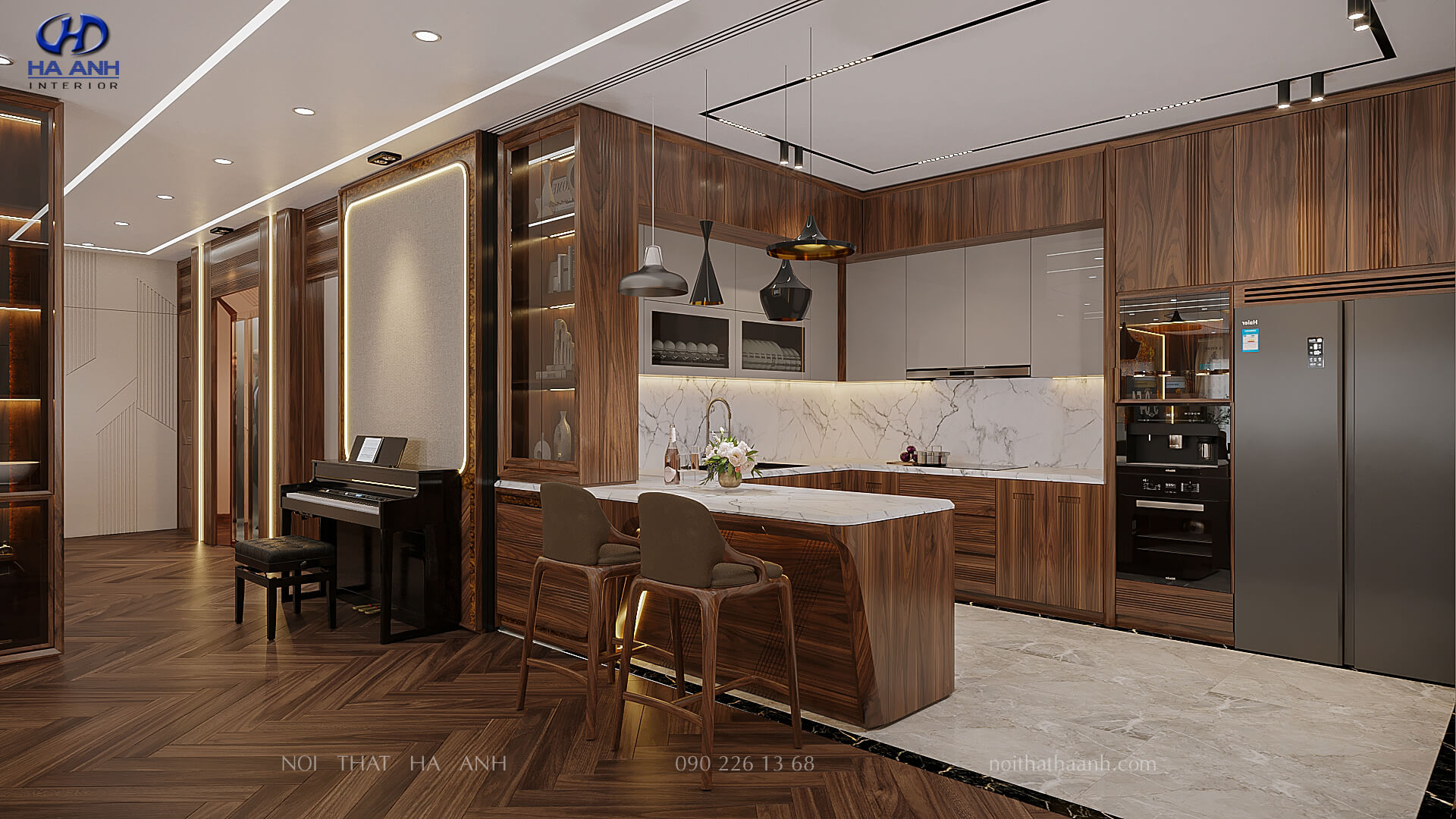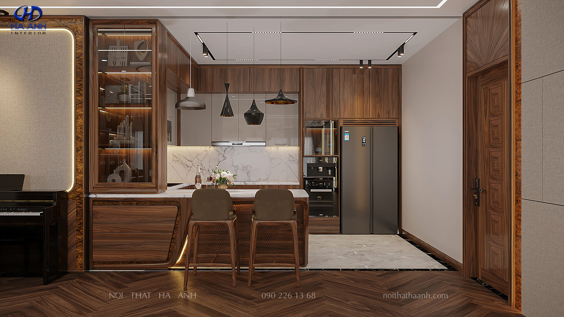 - Quầy Bar ( Bàn đảo ) : Gỗ óc chó tự nhiên, bề mặt hoàn thiện sơn PU inchem màu nâu đen