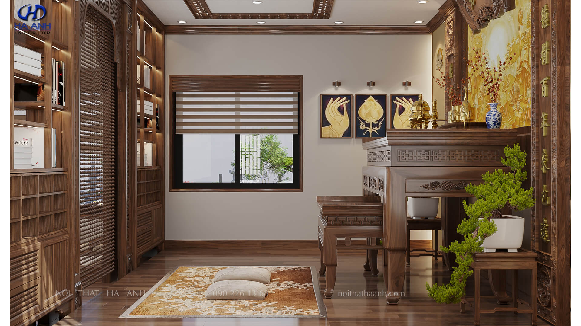 - Hệ vách sau bàn thờ : Gỗ óc chó tự nhiên, bề mặt hoàn thiện sơn PU inchem màu chỉ định kết hợp tranh trúc chỉ