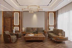 - Vách tivi và vách sau sofa: Khung gỗ óc chó tự nhiên nhập khẩu bắc mỹ kết hợp đá tự nhiên vân mây