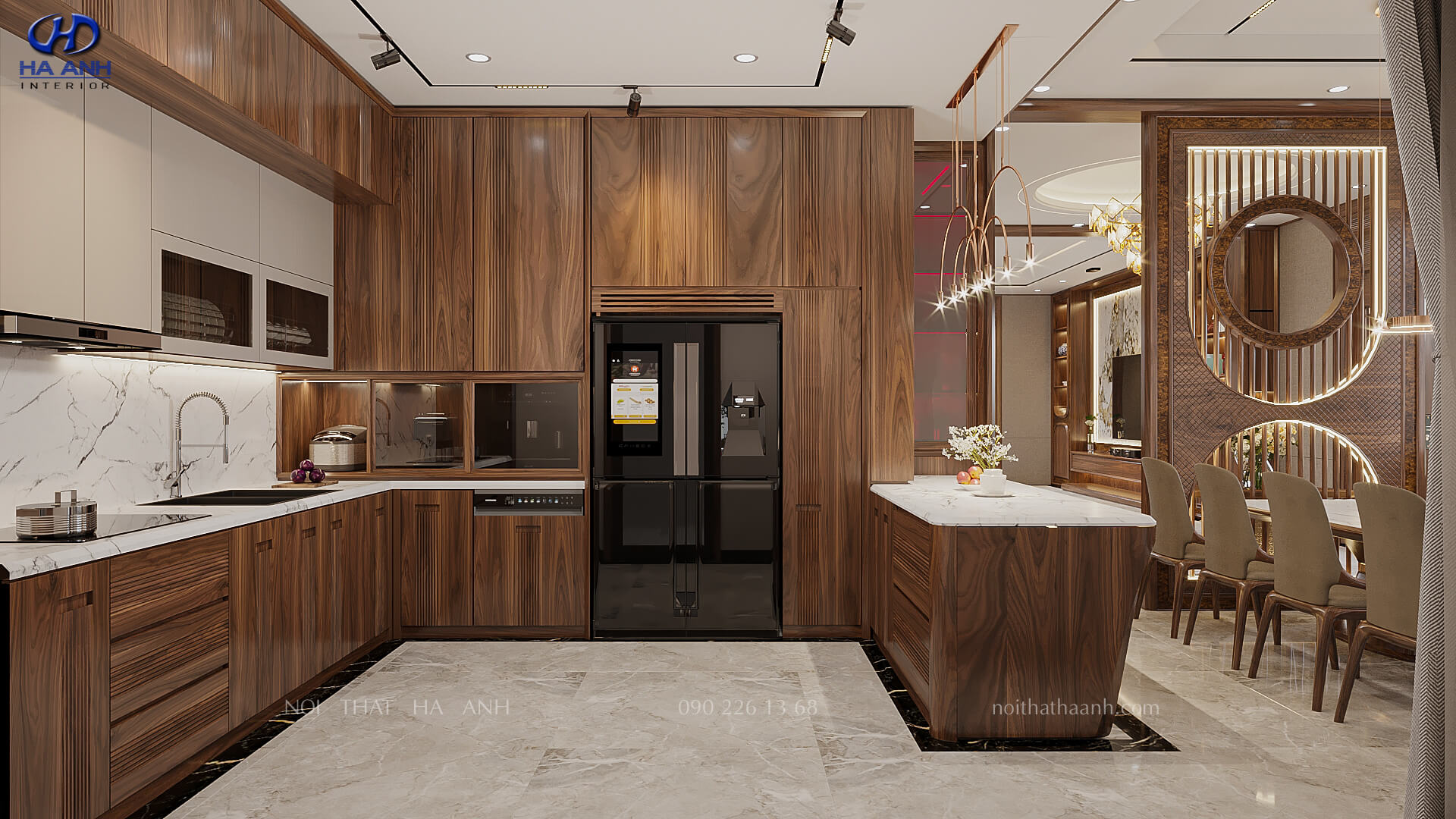 Bày trí không gian tủ bếp gỗ óc chó mang đến sự hài hòa và không kém phần sang trọng cho nhà bếp của bạn.